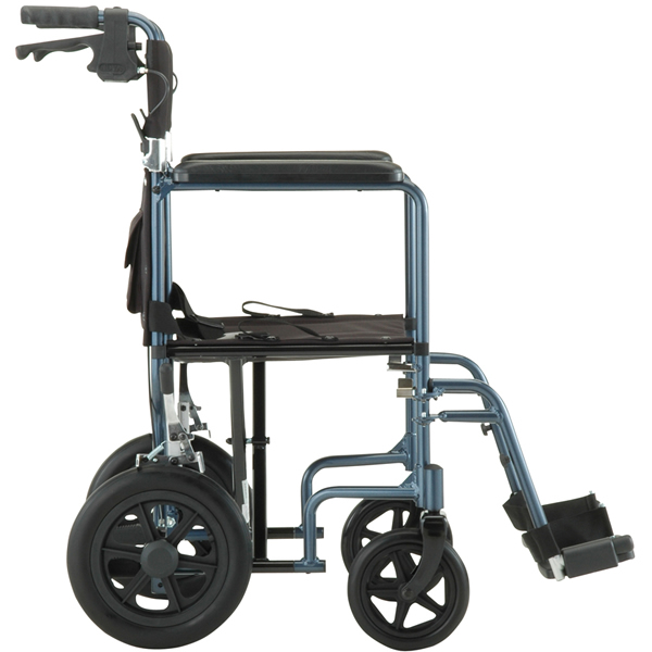 The 22 inch Lightweight Transport Chair has a lightweight aluminum frame and padded upholstery. It is foldable with 12" rear wheels, and has a quick release fold-down back, as well as padded, fixed full-length arms for added comfort. This transport chair has locking rear wheels and includes hand brakes for added safety and control.