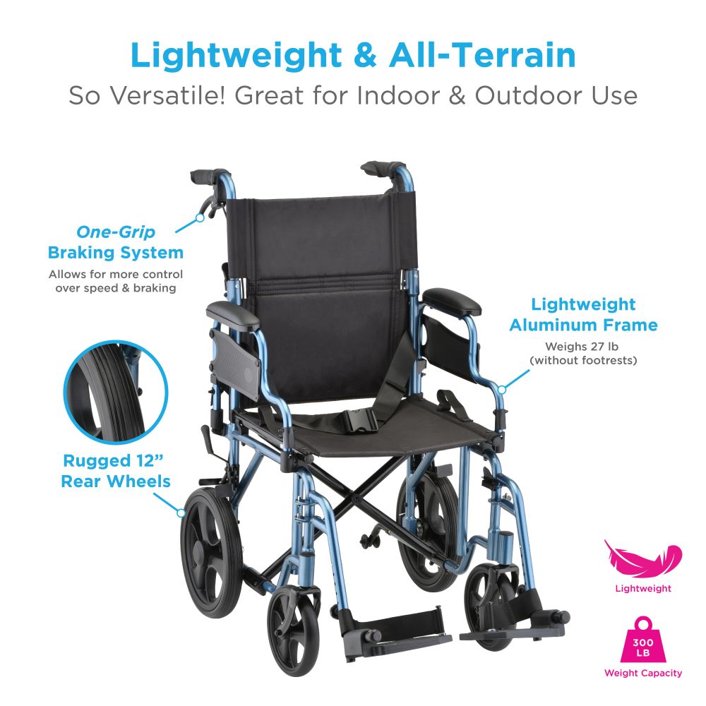 The Lightweight Transport Chair 19 in. has a lightweight aluminum frame and padded upholstery. It has a quick release fold-down back, as well as padded, detachable/reversible desk arms for added convenience. This transport chair has locking rear wheels, as well as hand brakes for added safety and control.